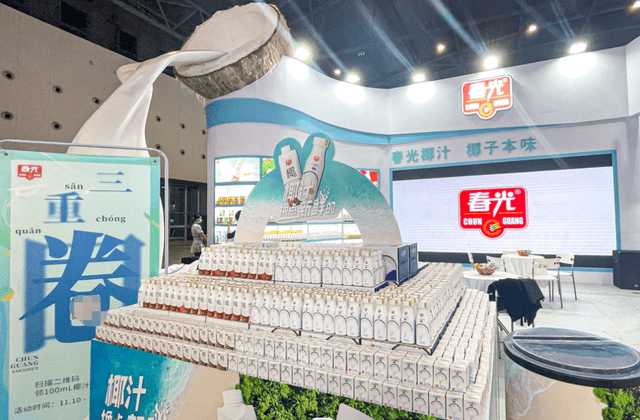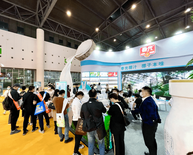 春光直接在展位上豎起了高大的椰子模型,加上傾瀉而出的奶白椰汁,極具海南風韻,數(shù)米外都能感覺到椰香撲鼻。