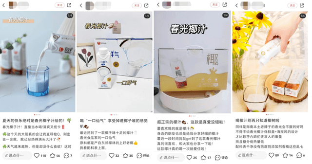 在線上的推廣中,春光多次登上頭部主播直播間,獲得廣東夫婦、東方甄選、王芳、曹穎、劉濤等眾多明星及主播信任站臺,在直播評論區(qū)中,“好喝”“椰味濃郁”“口感新鮮”“無限回購”等成為粉絲評價的高頻詞。