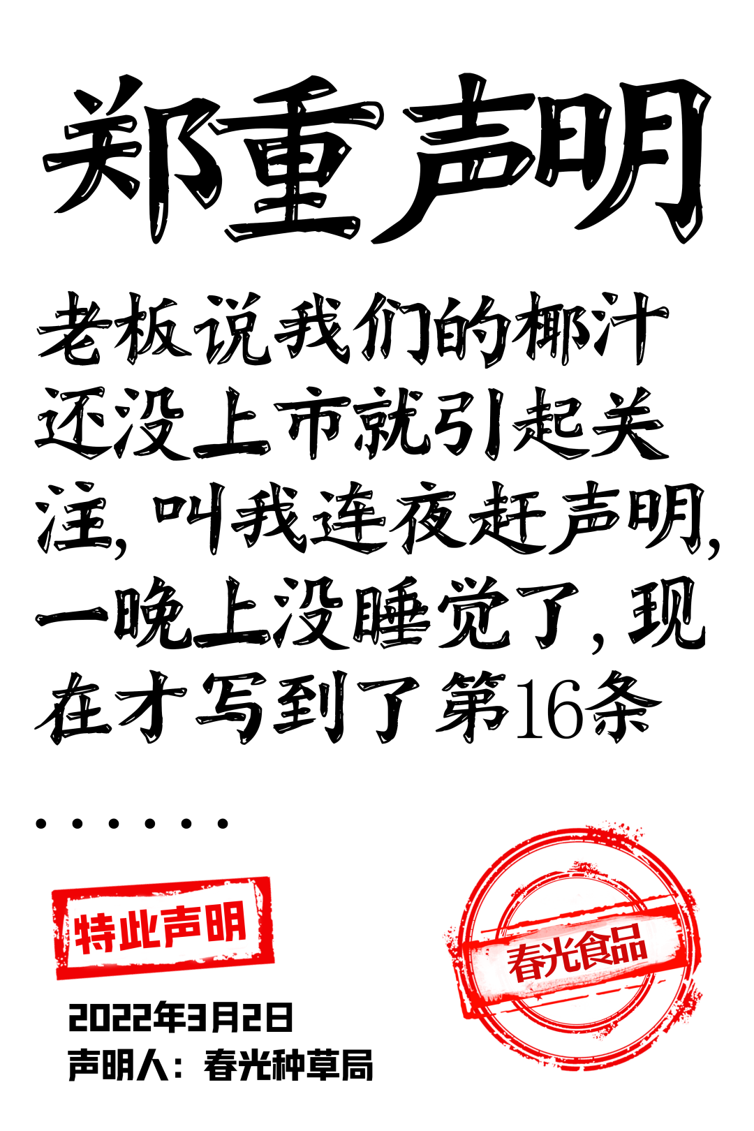 在新品官宣期間,春光食品連發(fā)26條新品聲明,用簡(jiǎn)單粗暴又不失趣味性的文案高效傳遞了品牌態(tài)度與產(chǎn)品賣(mài)點(diǎn),在大量地圍觀和傳播擴(kuò)散之下,聲明文案成功地吸引了廣大網(wǎng)友的注意力。據(jù)了解,接下來(lái)春光食品還將開(kāi)辦線(xiàn)下品鑒會(huì)快閃店、圍繞產(chǎn)品設(shè)計(jì)ip卡通等一系列年輕化動(dòng)作。