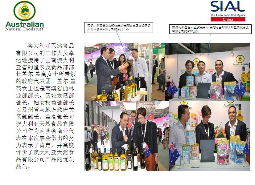 作為一家在澳洲自行生產(chǎn)優(yōu)質(zhì)本土產(chǎn)品及大力開展出口業(yè)務(wù)的澳洲公司,澳大利亞天然食品有限公司備受澳洲政府的高度重視及大力支持。南澳大利亞省的漁農(nóng)及食品部部長蓋爾·蓋高女士所帶領(lǐng)的政府代表團親臨展位助威宣傳。蓋爾·蓋高女士也是南澳省的林業(yè)部部長,區(qū)域發(fā)展部部長,婦女權(quán)益部部長以及州省與地方政府關(guān)系部部長。蓋高部長對澳大利亞天然食品有限公司作為南澳省商業(yè)代表在本次展會做出的努力表示了肯定,并高度評價了澳大利亞天然食品有限公司產(chǎn)品的優(yōu)質(zhì)品質(zhì)。南澳省阿德萊德市的前任市長愛弗雷德, SIAL展澳大利亞代表團官員琳達(dá)·甘妮和南澳省商務(wù)部國際貿(mào)易處的官員程添娥女士也來到了澳大利亞天然食品有限公司的展位,她們就澳洲本土產(chǎn)品的生產(chǎn)、加工、出口等問題提出了寶貴的建議和意見。文昌市春光食品有限公司是澳大利亞天然食品有限公司中國總代理,本次展會的成功舉辦得到了該公司的大力支持。